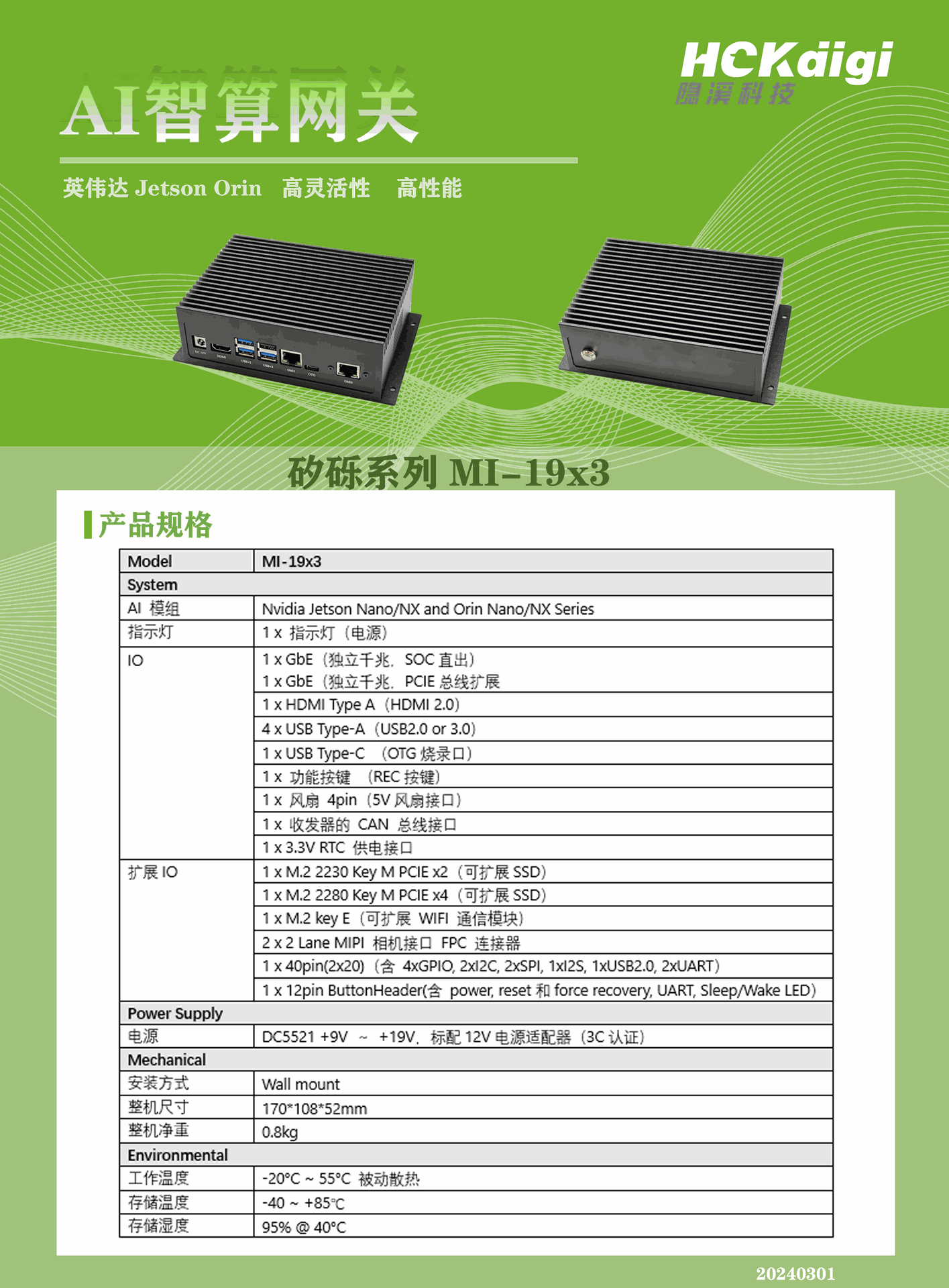 AI模组支持 MI-19x3支持Nvidia Jetson Nano/NX and Orin Nano/NX Series模组,其强大的AI计算能力、能效比和灵活的应用场景。基于NVIDIA的高性能GPU和AI加速器,能够处理复杂的深度学习任务,同时保持低功耗,非常适合边缘计算应用。
